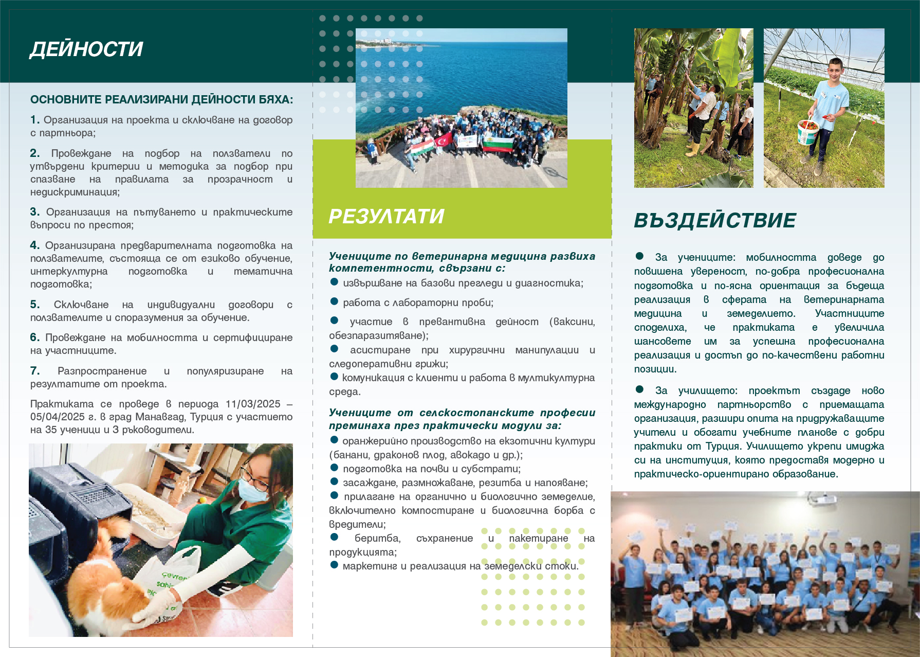 Учениците ще имат уникалната възможност да посетят водещи турски предприятия в областта на земеделието, да се запознаят с нововъведенията в бранша и да развият своите професионални умения.
